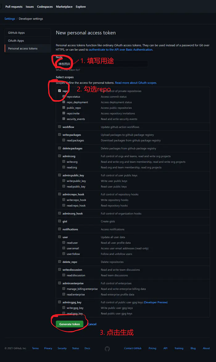 以此打开 Settings -> Developer settings -> Personal access tokens,最后点击 generate new token;