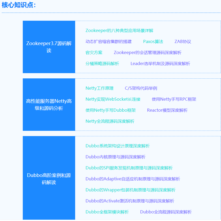 Dubbo因较高的效率大厂使用众多,且具有“微内核+插件”的无限扩展性。滴滴、当当、去哪儿网、工行、银联、中国人寿、淘宝、天猫等正在向或已完成Dubbo迁移。课程深入讲授Dubbo的注册中心Zookeeper:Paxos算法、ZAB协议、Leader选举算法、八种典型应用场景以及Zookeeper的核心源码解析;深入讲授Dubbo框架:从全生态用法到Dubbo内核原理与源码,再到Dubbo全框架源码解析!