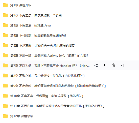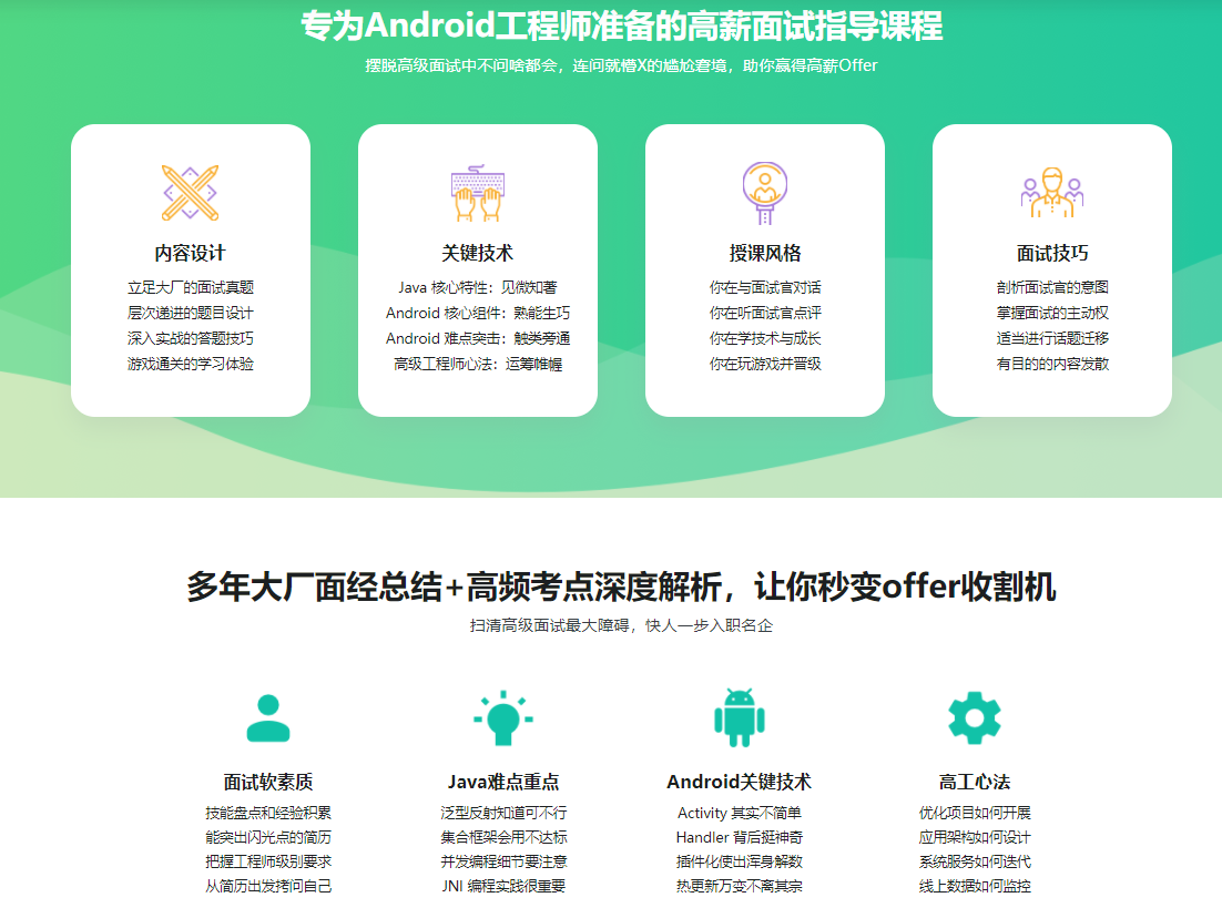 课程专为Android中高级工程师打造,针对面试中可能遇到的关键知识,进行深入分析讲解,为面试者还原面试官视角,带领面试者打开视野,快速在面试中突出亮点取得高分,拿下高薪。