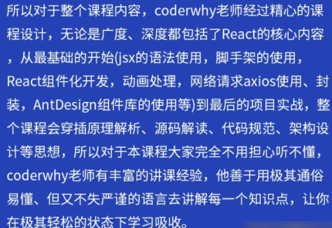 课程主要针对React零基础学员配备,主要讲的内容包括:React零基础深入全面学习;Redux核心完全掌握、熟练应用;全面拥抱hooks特性:特性讲解、项目实战应用;穿插React理论、源码讲解,应用、原理全掌握。