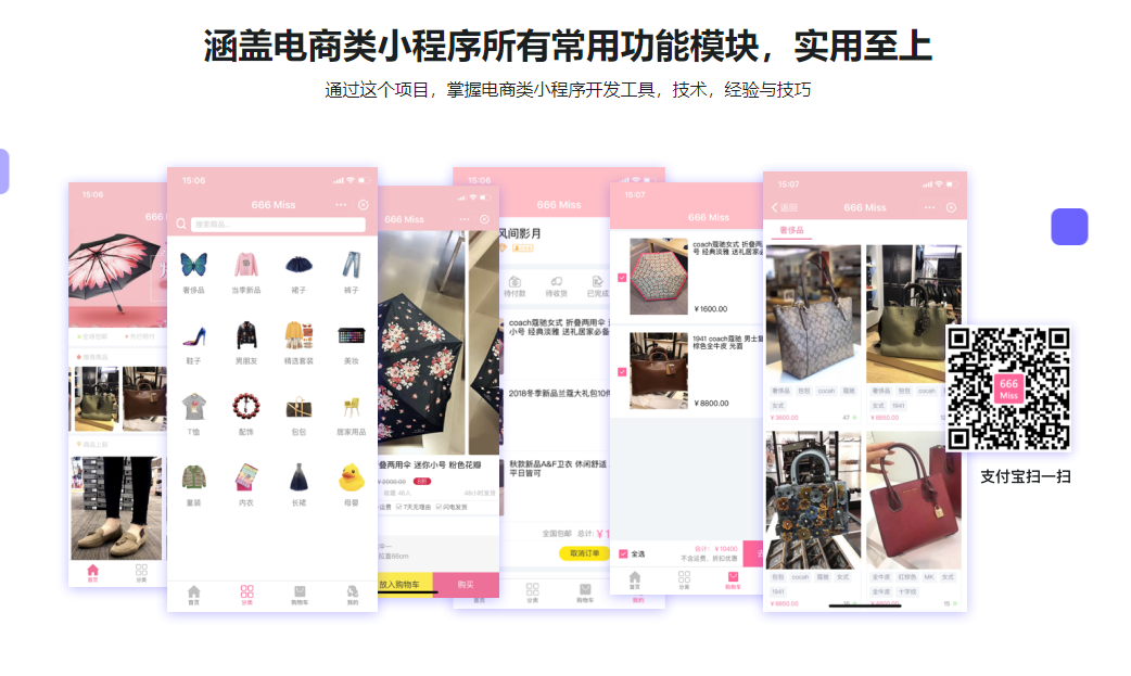 - 课程选用线上真实项目,带你积累商业级小程序开发经验;同时采用RESTful风格API,对接线上数据,突破小程序与服务端交互难题。从基础知识讲解到原理剖析,在开发的同时学懂核心技术点;课中结合老师丰富的开发经验,让你少走弯路,迅速成长。