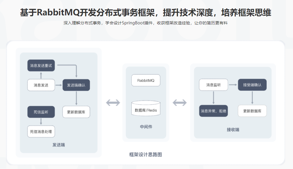 大部分同学的现状是:熟悉表面理论知识,却无法很好应用到工作中。我们收到这些反馈后,才诞生了本课程。 为了避免只学到死知识、不敢在生产环境实操的尴尬局面。本课从知识上也是从入门到精通,但却全程用项目递进的方式讲授知识。目标就是会用,课程中还融入了很多开发小Tips。并且把深度做足:解读核心源码,基于RabbitMQ二次开发,手写分布式事务框架,提升技术深度,培养框架思维。