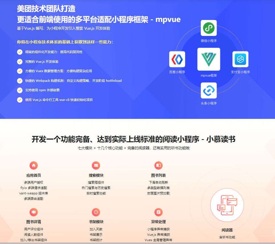 课程选用小慕读书项目,带你征战四大主流小程序平台。为降低门槛,课程从小程序入门开始,再到Vue.js、mpvue、vue-router和Vuex,以及Git工具,一应俱全。最后,从项目规划到四大平台上线发布,带你体验商业级小程序的魅力。
