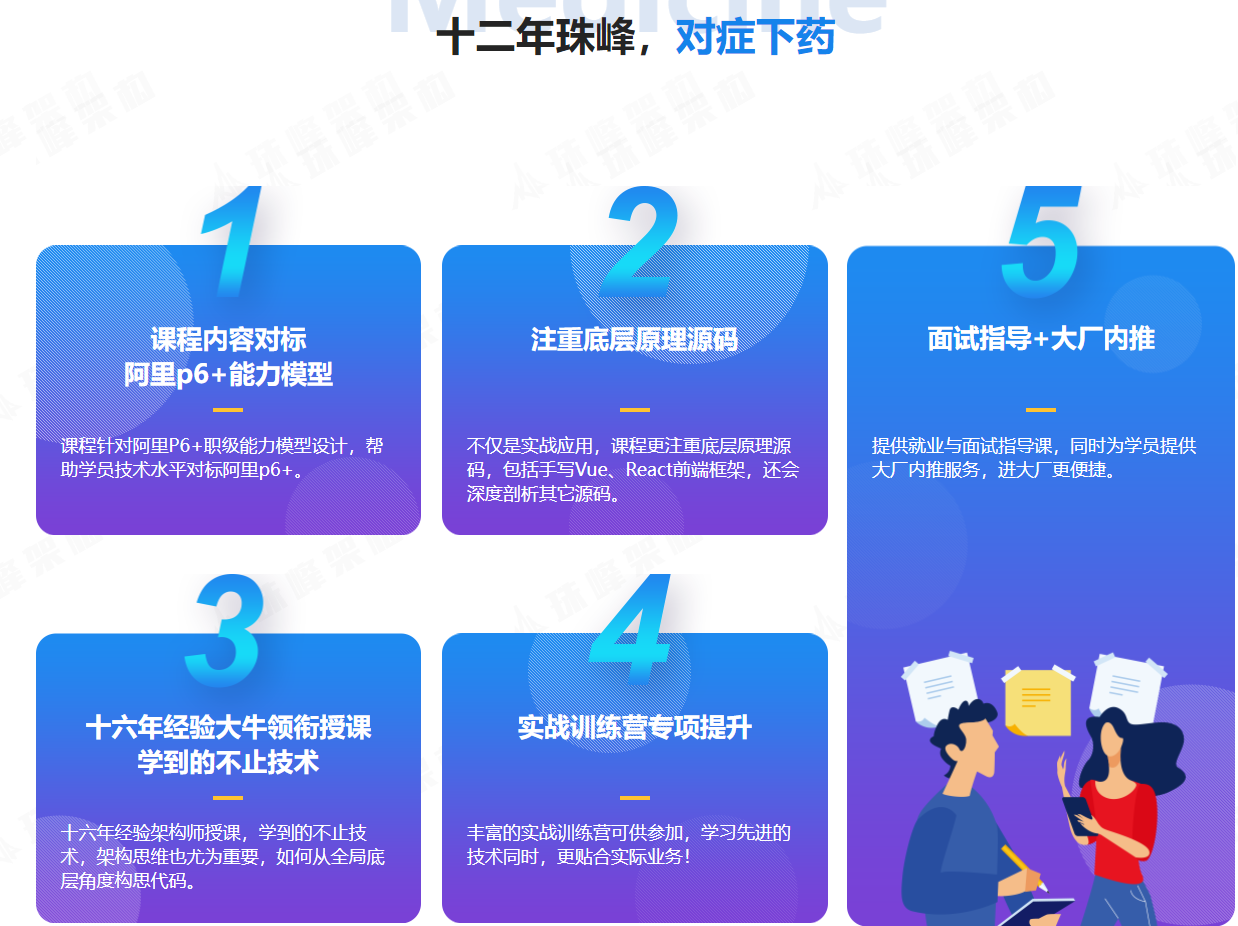 阿里p6+能力模型 课程针对阿里P6+职级能力模型设计,帮助学员技术水平对标阿里p6+。 不仅是实战应用,课程更注重底层原理源码,包括手写Vue、react前端框架,还会深度剖析其它源码。 学到的不止技术 十六年经验架构师授课,学到的不止技术,架构思维也尤为重要,如何从全局底层角度构思代码。 丰富的实战训练营可供参加,学习先进的技术同时,更贴合实际业务!