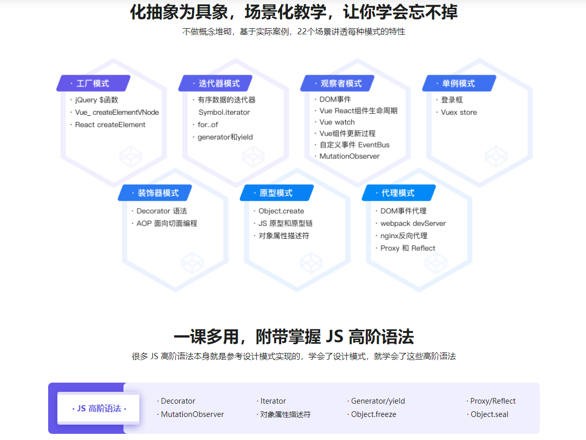 从“写代码”到“写好代码”到“设计代码”,不仅是技术的提升,更是编程思维的提升,其中最关键的就是设计模式。但很多人想学习设计模式时,往往是查到的资料一堆,有用的知识少见,学得云里雾里,难以实践。本课从23种设计模式中精选前端常用的7种设计模式,利用场景化实例教学,让想学的人真正学明白、会应用、能实践。