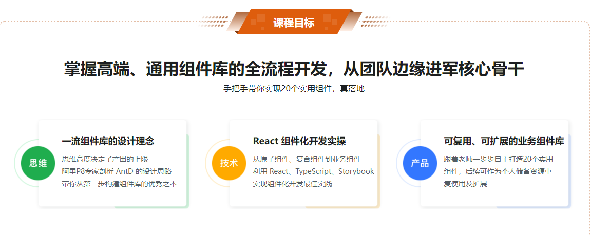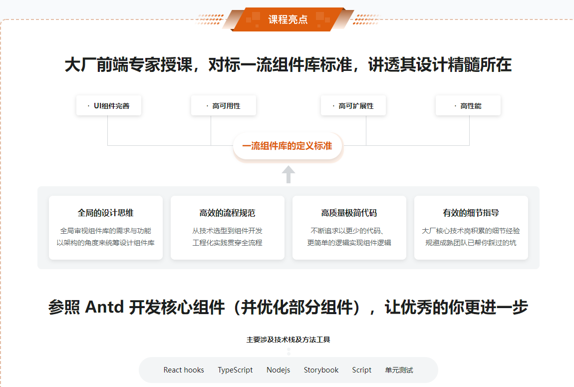 React18 开发仿 AntD 组件库,学习业内一流的组件库设计思路与落地实践 前端项目到了一定规模,基本都会沉淀自身组件库——组件库服务于整个团队,是所有项目的基座。如果能开发符合团队需求的组件库,那么你已经是团队的核心主力了。本课程由大厂前端专家授课,从一个高级前端开发的角度做一套类似 AntD 的组件库,在这个过程中讲透优秀组件库的搭建思路及实现方式,让你迅速具备搭建前端基础设施的重要能力。 适合人群