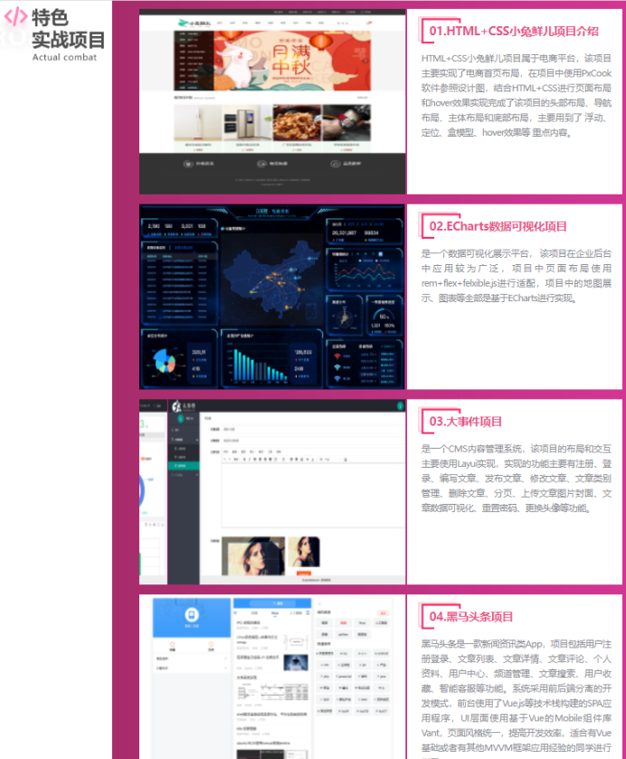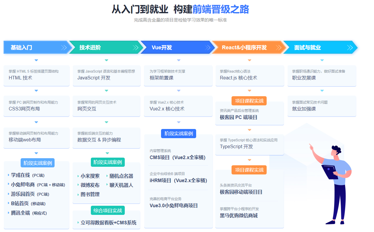 随着移动互联网的深入发展,多屏互动和多端兼容友好的界面成为目前系统重要的需求,让前端开发工程师一跃成为目前市场紧俏的人才。 本课程内容包含目前的Vue、React前端框架,把全栈工程师要掌握的前端技术、Node.js相关后台技术、HTML5移动方向开发技术做了系统整合, 致力于培养中高级前端工程师。