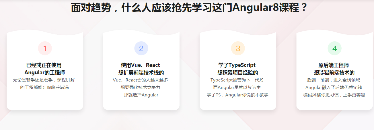 新版的框架,火爆的项目,酣畅的实战,带你收获满满的干货,你会发现,其实Angular并不是像传闻说的那样“很难”,相反,你会发现Angular的很多思想是非常领先的,课程从基础开始,但并非浅尝辄止,会为你呈现一个完整的Angular 学习路径