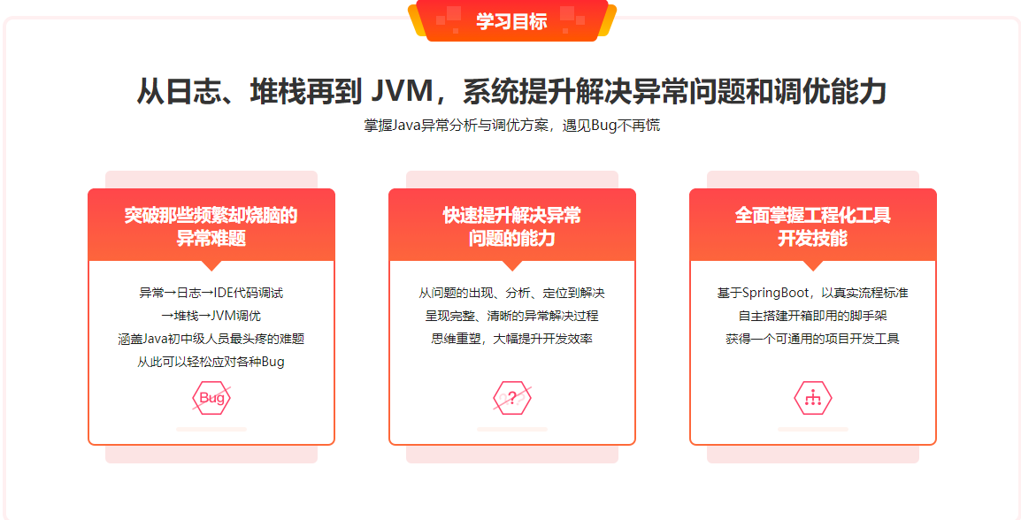 项目异常不断,找不到问题所在?百度、Google搜个遍,也找不到答案?本课程针对Java开发中常见的各种异常,从日志、堆栈再深入到JVM,带你发现问题、定位问题、解决问题,最后在实战中搭建开箱即用的SpringBoot脚手架,强化巩固所学,助力你提升开发技能!