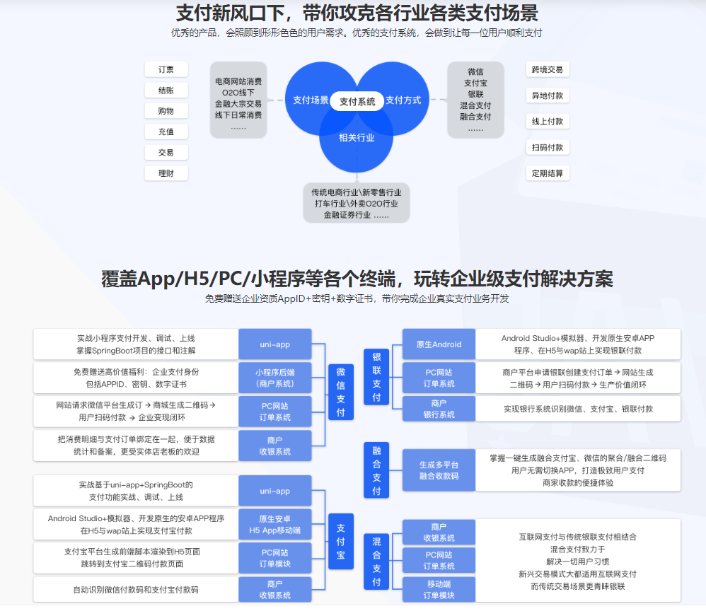 支付是企业实现生产价值最关键的一环,从事支付一定是企业核心业务。而无论何种销售形式,都离不开最关键的 “支付”环节。本课程带你实战实战移动端、PC端、H5等多终端的支付系统,本系统可对接各类真实业务系统,如外卖、电商、订票等各行业的业务系统,,为系统对接上支持微信、支付宝、银联、融合支付、混合支付等多种企业级支付模式,让你的系统一键支持【支付】功能。无论你是前端还是后端,只要你自认为是力争上游的后浪一员,都应该尽早攻克支付技术。
