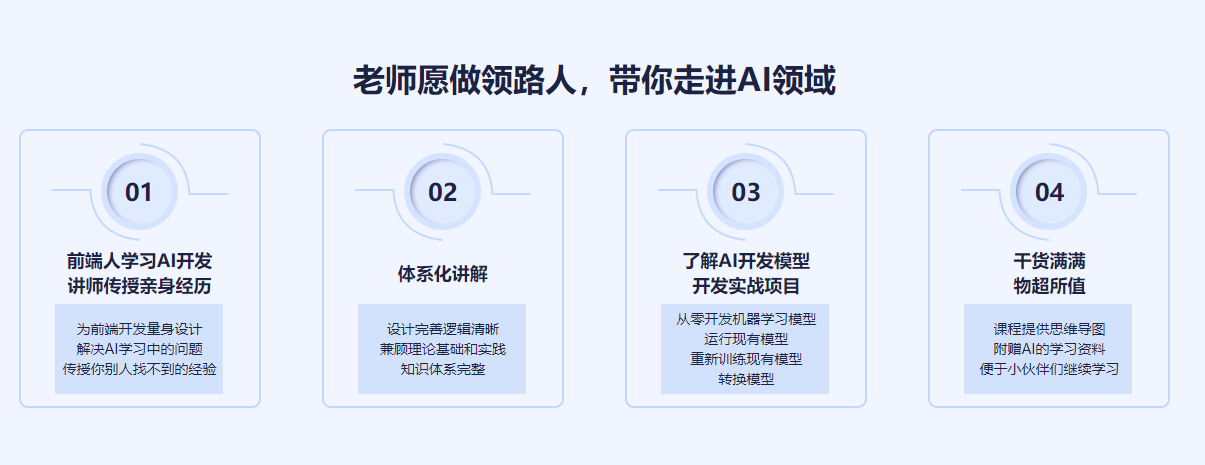 专为前端工程师准备的AI课程来了!!人工智能时代已经来临,而前端同学对于AI领域大都处于陌生状态,想学习又找不到靠谱的老师,也没有面向前端的人工智能学习资料。本课程以 JavaScript 作为实现语言,以Tensorflow.js作为主要框架,通过十几个经典案例、覆盖神经网络和机器学习的理论知识、带你亲手完成图片分类与语音识别等落地项目,帮你理清整个学习体系,轻松入门AI领域,不惧未来挑战。