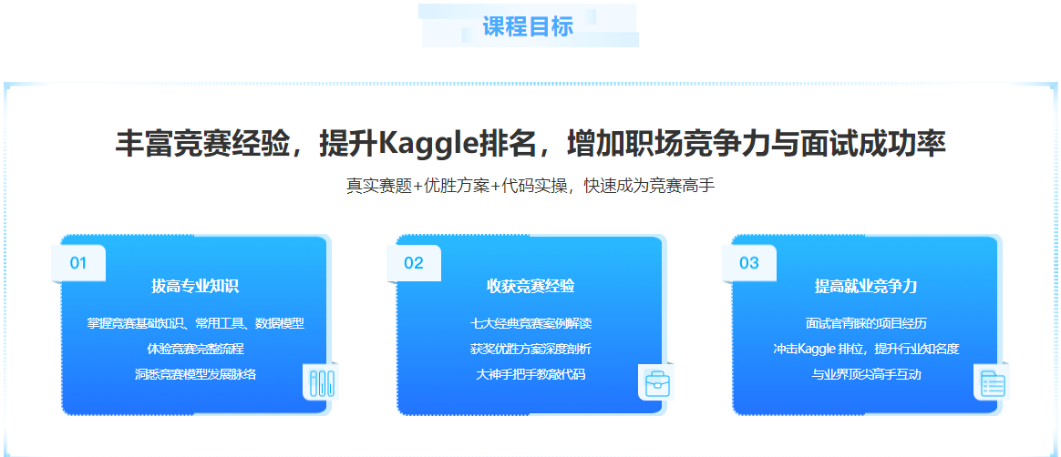 Kaggle 是业界高度认可的数据科学竞赛平台,如果你的简历中有丰富的 Kaggle竞赛经验,将大大提升你的就业竞争力和成功率。本课程将深度剖析7大经典案例,带你全面掌握多领域竞赛题目,助力你快速增加项目经验,提升竞赛排名。