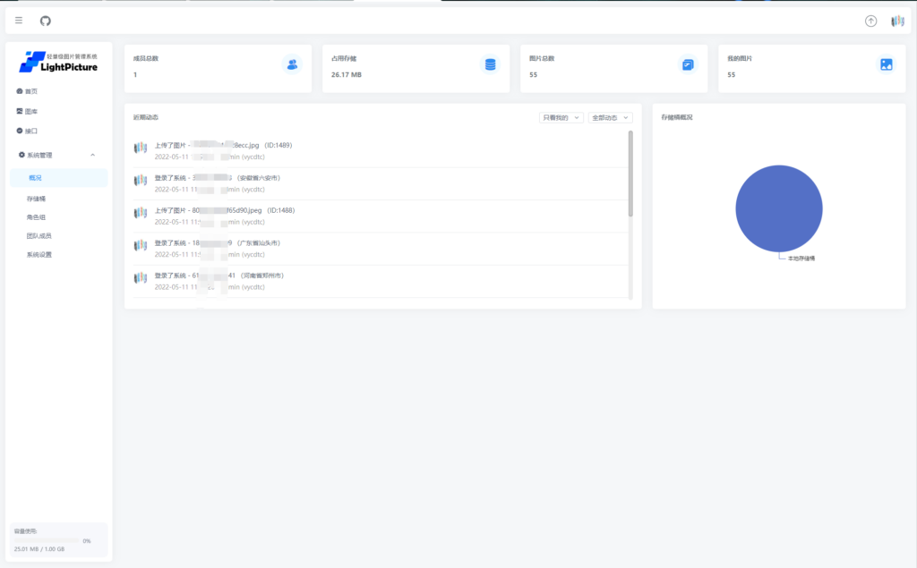 LightPicture – 开源图床系统 高性能、精致、扁平化、多样化储存式的企业化免费图床程序,LightPicture图床系统支持第三方云储存,本地、阿里云 OSS、腾讯云 COS、七牛云 支持多桶储存,可同时添加多个对象存储桶管理 多图上传、拖拽上传、粘贴上传、上传预览、全屏预览、一键复制图片外链 多用户管理、分组管理;不同分组用户控制不同的存储桶 完整的权限控制功能,不同用户组可分配不同的操作权限,控制其上传删除及查看 完整的可视化日志功能,记录用户所有操作,方便事件溯源 全局配置用户初始剩余储存空间、设置指定用户剩余储存空间 支持接口上传、接口删除 原创Geek扁平化页面风格,简约大气;前端使用vue开发,前后端分离