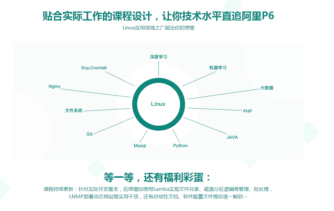 人工智能、物联网、大数据时代,Linux正有着一统天下的趋势,几乎每个程序员岗位,都要求掌握Linux。但市面教程往往开篇就是命令使用,令很多新手难以理解、望而却步。本课程不同以往,从培养兴趣开始循序渐进,零基础也能轻松入门。课程特别设计了云服务器安装CentOS等侧重实战内容,还原真实线上环境,提高开发效率,助你快速成为Linux高手。