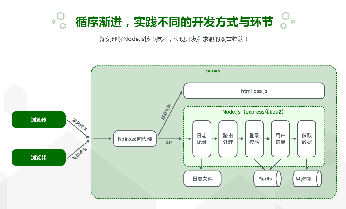 前端开发人员必备技能Node.js提升课程。本课程以博客项目为主线,由浅入深讲解 Node.js 基础知识、框架和插件原理、web Server 的特点与必备模块;同时运用 Node.js 原生和常用框架 Express、Koa2框架三种方式开发web Server,在项目开发过程中全面掌握Node.js。掌握全栈工程师必备技能,为你带来开发和求职的双重收获!