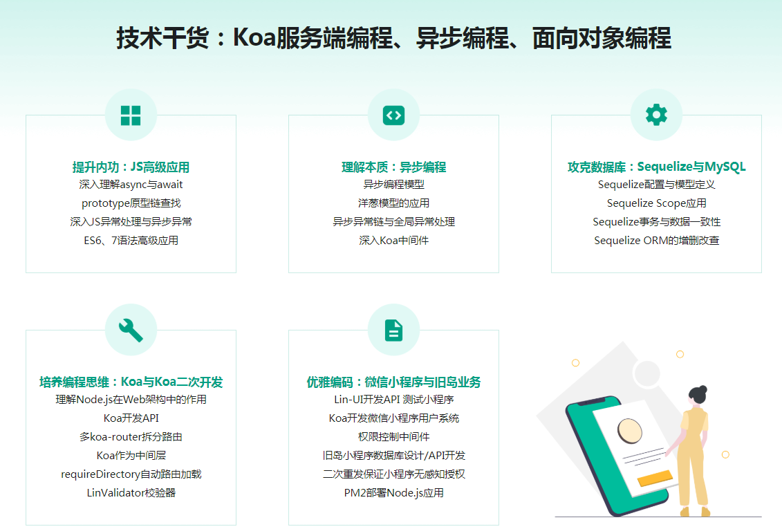 Nodejs逐渐成为前端同学进阶的必修技术之一,本课程将带大家从0到1开发一个前后端分离的精品项目《旧岛》,手把手教你用Node.js KOA2打造超好用的 Web框架,从而带前端同学彻底攻克服务端开发难点和头疼的Mysql数据库知识,本课程除了常规的业务开发更包含有大量的JS中高级 知识应用、异步编程与编程思维,对于同学们开发前端有极大的帮助,课程不仅是带前端同学深度学习Nodejs服务端开发,更是同学们就业升职的利器。