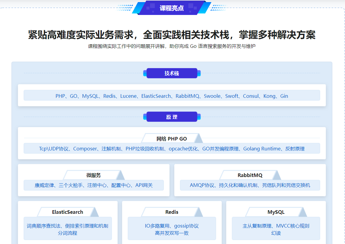 PHP进阶高级研发或者架构师必须掌握的能力(源码剖析和框架定制能力、分布式/微服务架构能力、 高性能高可用业务场景解决能力、海量数据存储/分布式缓存能力、海量数据搜索能力、高可用消息中间件能力、 平台性能调优能力、数据结构和算法能力),课程结合上面几点打造千万级项目架构设计。…