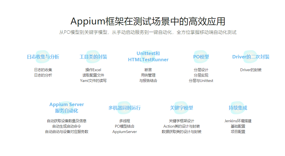 说到APP自动化测试,Appium可是说是非常流行了, 不仅支持多语言、多平台的优势,同时支持Andriod、iOS、H5的自动化测试;本课程会从初级的Appium框架讲起,涉及业界常见的po模型、关键字模型、服务自动化、持续集成等实战讲解,让你快速上手移动端自动化测试工作,高薪工作手到擒来!