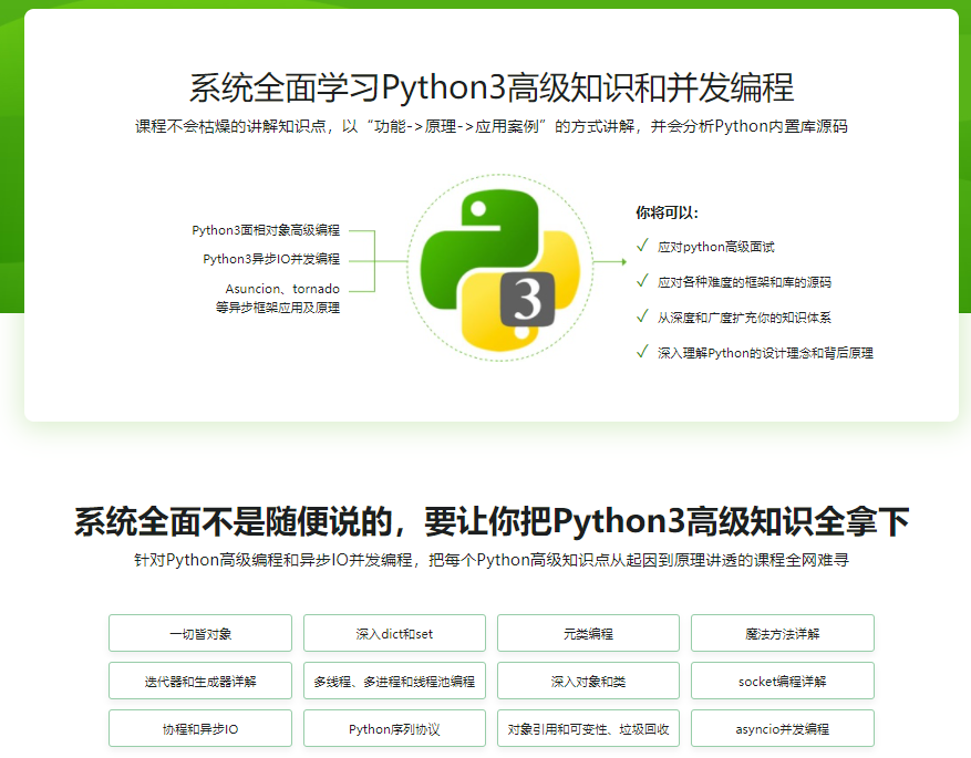 这门课程是初中级Python开发人员向高级进阶的必学课程!许多Pythoner喜欢追求新的框架,却不知道,语言本身的进阶优先于框架,大公司更注重语言本身的功底。学透了Python高级基础知识再学习其它框架,才会事半功倍!