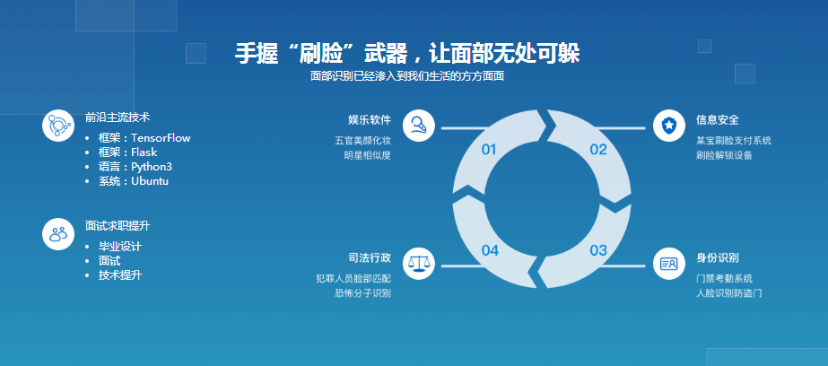 伴随着人工智能技术的发展,深度学习技术变得越来越热门,越来越多的人选择转行做深度学习算法工程师。本课程围绕人脸相关技术,展开多个模型的教学,涉及人脸检测、人脸匹配、人脸关键点定位等基础研究技术,最终搭建一个人脸智能小程序,完成整个项目的实战应用,最终可以达到算法工程师的初步要求。