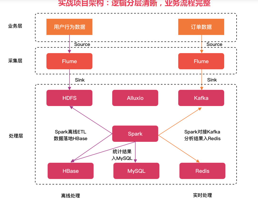 本课程以Spark为项目主线,整合Redis和HBase打造以Spark技术栈为核心的离线处理项目以及实时处理项目,以功能实现为基础,并通过调优及重构功能实现,达到满足企业级生产的水平,带你在实战中进行Spark进阶。另外,课程最后讲解了Alluxio整合Hadoop和Spark的使用,以更好的拓展大家的视野