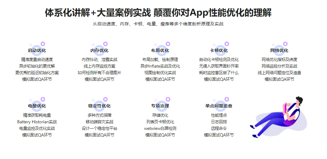 - 课程将从启动速度、内存、卡顿、电量、流量、瘦身等多个纬度进行原理剖析以及解决实战,同时每个章节还配备了模拟面试环节,颠覆你对性能优化的理解,最终让你的技术能力和优化经验得到前所未有的提升。