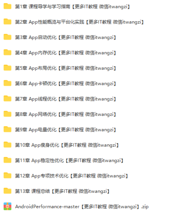 - 本章节带领大家一起学习大型App优化中一定会有的专项技术优化,涉及列表卡顿页优化、Android存储优化、WebView白屏问题等。