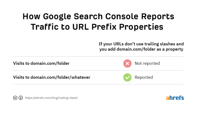 确定是否使用斜杠时应考虑报告。例如,在Google Search Console中,您可以设置域或URL前缀属性。如果您在设置URL前缀属性(例如域/文件夹)时不添加斜杠,那么Google还是会添加一个。结果,将不会报告对domain.com/folder的所有访问(不包含结尾的垃圾),因为domain.com/folder/(带有斜杠)的级别更高。