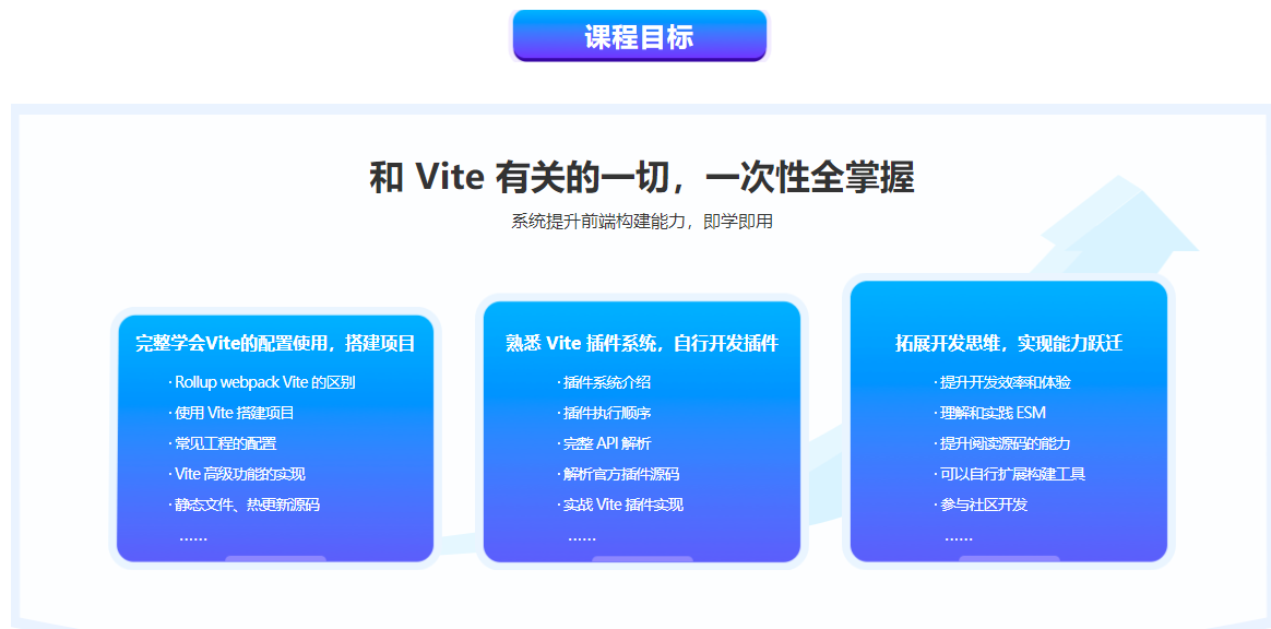 Vite 因为其跨前端框架的能力和极其优越的性能,被称为下一代前端构建工具。如果你想在未来几年有更好的发展空间,那么最好尽早学会 Vite。 我们将从如何配置使用入手,深入到Vite的场景、插件以及源码,帮助大家系统掌握 Vite,全面提升对前端构建的认知,更能自行构建项目,为进阶前端架构师打下坚实的基础。