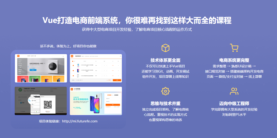 现阶段,电商系统随处可见,具有很大市场潜力;同时因为商城系统复杂,涉及到丰富的知识点,如果能进行电商系统的开发,其它各类型的前端系统也能掌握。本课程以Vue全家桶作为主要的技术体系,模拟小米商城,带大家从0开始开发网页和交互功能。你能进行完整的项目架构、体会页面开发的全流程、学习丰富的技术栈和各类组件知识,还能了解Git、动画、开发调试等方面的知识。同时项目本身具有很强的实用性,稍作修改,便能“为我所用”。相信此课程能助你快速进击中级工程师。