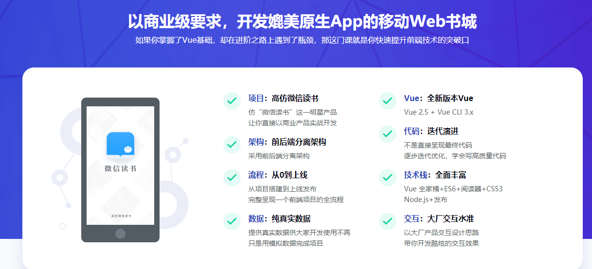 运用Vue开发一个可商用、功能完备的Web阅读应用。在开发中,将各种知识点穿插应用,让你真实感受到一个明星产品开发的全过程。同时,项目提供一流的用户体验和交互水准,在实现功能之外带你探究各种优秀前端交互的设计和实现。