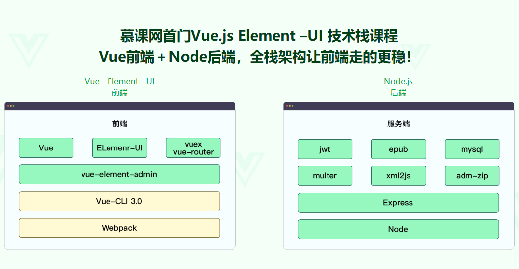 综合应用 Vue 和 Node 技术,基于 Element-UI 组件库搭建“小慕读书“的管理后台,通过 Node 实现了电子书上传和解析功能以及权限管理。课程对 Vue 和 Node 有较为深入的应用,不仅会教大家如何实现功能,更会讲解技术背后的原理,帮助大家做到举一反三。课程面向中高级开发者,提供完整的开发文档和API支持,让大家可以快速上手实战