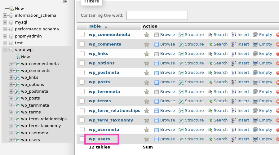 3.现在单击用户表。(在这种情况下,它的 wp_users 可能会根据您的表前缀而有所不同)
