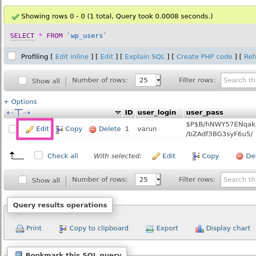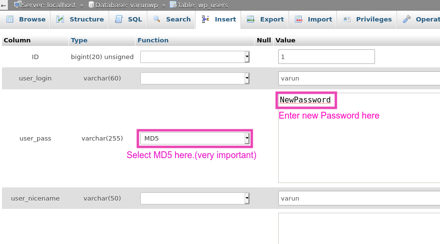 5.在 user_pass 字段中,输入新密码(在本例中为“ NewPassword ”)并从下拉列表中选择 MD5(非常重要,因为 WordPress 使用 MD5 散列)。